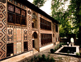 The original and unique character of Sheki connected with its picturesque natural background became especially clear after Sheki's transfer into a new place in the second half of the 18th centry followed by intensive residental construction. Rich green massive and the original Sheki's structures with deeply shaded eivans,framed with white walls or later built structures with walls made of brick and roughly cut river cobbled the town's lovely outward appearance. The peoples dwelling reflected all peculiarities silk production of this rich district.The dwelling comprised as a rule an isolated farmstead hidden in orchards and mulberry tree plantings.A house itself was of a rectangular configuration and was placed on a thick platform finished with stone and brick, protruding into the yard side in the Aphsheron dwellings as a terrace.The side facade blanks walls faced the street.The main facade oriented usually to south of southeast,faced the yard.The house planningis characterized by a singlerow arrangement of residential rooms,in front of which there was usually an eivan. Sometimes--when the building was located at the back of the site,there was another eivan at the rear wall,but the single-row location of the rooms is preserved. Another specific type of the Sheki dwelling is a two-storey one-row dwelling house without eivans. In such houses the planning of the ground and first floors is the same,but the facade walls were treated in different way,i.e. on the first floor as the solid windows-shebeke. A high sloping roof,which protects from precipitations and is used for specific household purposes--drying and storage of fruit at the garrets,keeping and rearing the silk worms,is of particular importance in making up the appearance of a Sheki house. The main compositional centre of the houses of the widely-spread type with protruding walls is a large eivan (verandah),which contrasts with light,smoothly plastered wall or coloured brick walls.Due to mild climate of the Sheki district,people spend the most part of the year on the eivan. This circumstance attracts the attention of architects to the eivan as a major element of the architectural design of the dwelling.the wooden pillars,beams,barrier,ce,iling,brackets of the eivan are carefully finished and profiled.The top of its wooden colonnade is usually decorated with pointed or threespated arches.The similar arches are used for door and window recesses.the walls of the eivan usually represent an interior and are finished accordingly. The houses without the eivan are provided with shebeke on the first floor as a central element of the facade composition.Shebeke are also very popular in Sheki and considered to be of a great artistic value. The interior decoration is also traditional for the Azerbaijan dwellings--rich decoration of bukhary,with symmetrically placed recesses takhcha and jumakhatan--decorated with stucco mouldings and cut ornament. In the houses of well-to-do people the walls and the ceilings are partly or wholly covered with painting or cut ornament of a plant character with impregnation of large flowers, birds,etc. At the end of the centry and the beginning of the 20th centry in Sheki there emerged the image of the urban dwelling house,wholly facing the street. The construction used in Sheki and Sheki district were almost identical to those in many other Azerbaijan foot-hill regions.A specific feature is a wooden frame inside the walls,which was to ensure seismic protection of the building. One of the monuments of the town construction art is a number of engineering town improvement elements preserved in Sheki.Here we should mention the remnants of the clay water-supply line.The clay waterlines are interrupted with numerous distributing wells-taksimgez-and completed with water distribution outlets in the form of a pouring stream.The taksimgez is a small quadrangular pool used instead of a water measuring device,monitors the water flow in water pressure reservoir of the present-day waterlines. Such waterline consisted of a system of clay tubes with four different diametres-ana-lyulya(mothertube),orta-lyulya(middle-tube),golgiran-lyulya(hand flowing-tube) and tapancha-lyulya(pistol-tube)--which were used for yard branches.The given scheme shows that the main preserved part of the town--Yukhary-bash--used water from the sources of Tajlyg,Gurjan,Alijanbek and Hasanbek.In the most cases water flew along the open bed that led to its contamination by rains and mud. The main waterline was directed from Tajlyg source along the right bank of the Gurjanachai river.At the distance of 50m the tubes branched off supplying water to separate residental areas.The Tajlyg and Alijanbek waterlines supplied water to the north-eastern part of the town.The Hasanbek line was directed along the upper part of Agamaly ogly street,April 28 street,Ali-Bairamov street and supplied water to living quarters including Agamaly ogly street,Vidadi street and Gyanjlar street.Now there is a water reservoir in the upper part of the Gurjanachai river,in Agamali ogly street. It is to be noted now the Tajlyg and Alijanbek lines include about 50-60% of the clat waterlines with diameter of 60-100 mm.The rest of the waterline is substituded for asbestos and cast-iron tubes.Apart from the above-mentioned items,the Sheki region has a number of Architectural-archaeological monuments worth studying.In conclusion note should be made of the following peculiar features of the construction work in Sheki. The town of Sheki newly erected in the second half of the 18th centry ia marked by a stylistic integrity and the ingenious application of the beauty of local landscape to architecture. The picturesque structures with deep eivans,made of brick mixed with cobble-stone,situated on the extremely rugged country,have reflected the peculiarities of the socioeconomic development of this rich silkworm breeding region of Azerbaijan. According the Decree of the Council of Ministers of the Aze